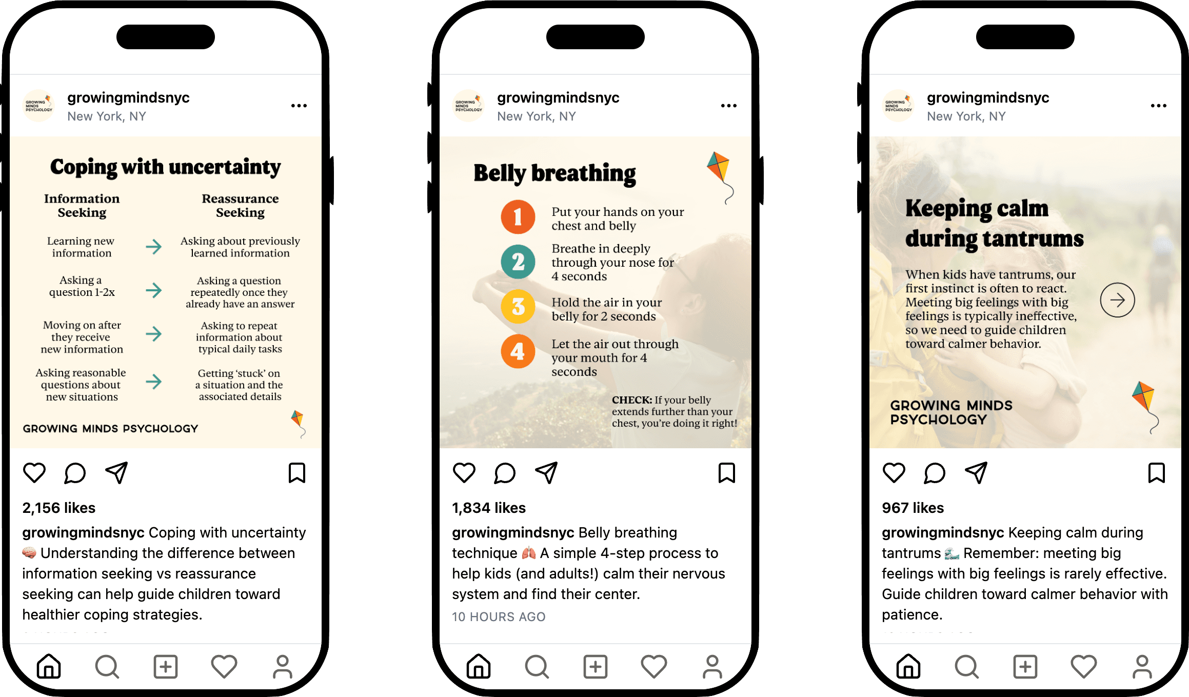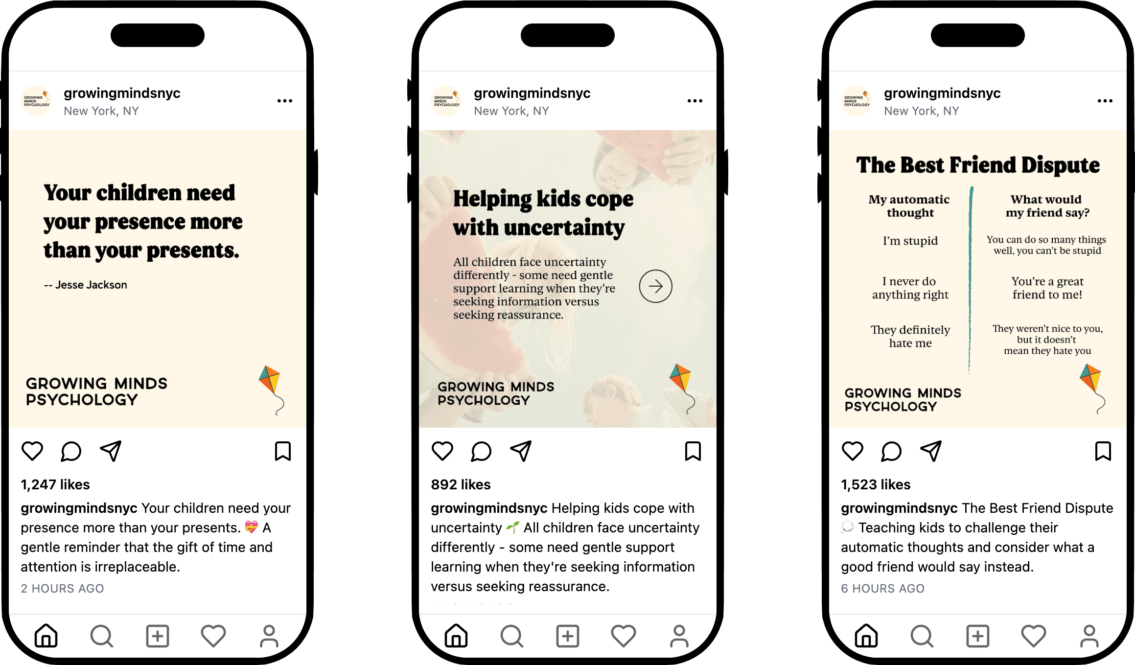 The new brand is inviting and approachable: softer, more colorful, and telling the story of Growing Minds' journey from small practice to thriving community hub. We created two distinctive styles: clean, narrative-driven typography for main headings that speaks to the seriousness of mental health, and a playful, curvy font for social media that catches parents' eyes on Instagram. The website features easy navigation, clear calls to action, an embedded booking widget, and full accessibility features including keyboard navigation and screen-reader support.